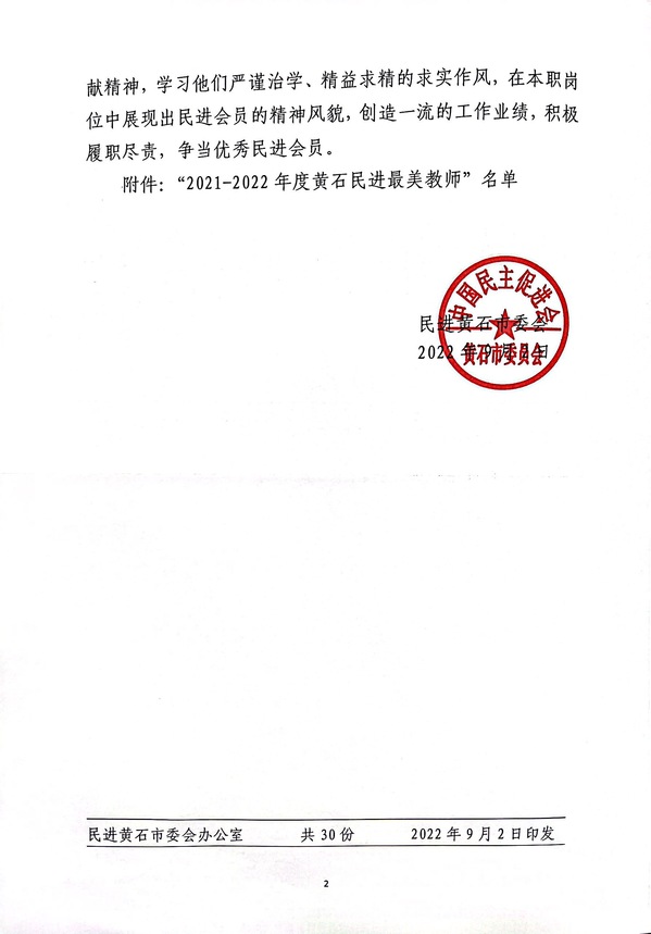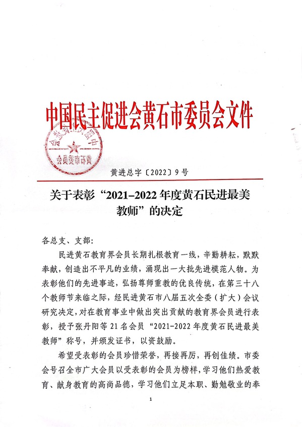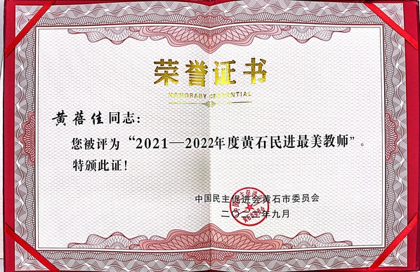 本网讯 近日,中国民主促进会黄石委员会决定,对在教育事业中做出突出贡献的教育界会员进行了表彰,中国一站式服务官网黄蓓佳同志荣获“2021-2022年度黄石民进最美教师”荣誉称号。