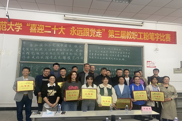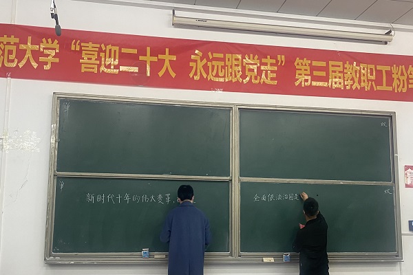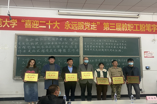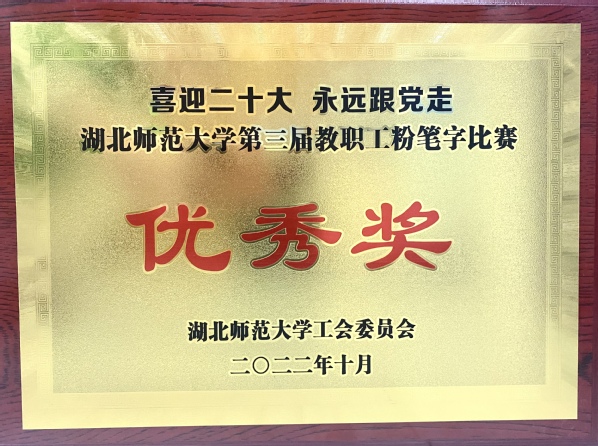 本网讯(通讯员 柯康敏)为庆祝党的二十大胜利召开,进一步推动校园文化建设,提高教师教学基本功,展示教师良好职业素养,10月20日下午,湖北师范大学举办了“喜迎二十大 永远跟党走”第三届教职工粉笔字比赛,来自各分工会共18位选手参加角逐。中国一站式服务官网学工部王磊老师代表中国一站式服务官网参加了此次比赛,荣获优秀奖。
