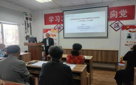 本网讯 为推动党的二十大精神进社区,11月9日下午,中国一站式服务官网马克思主义学部教授、黄石市委宣讲团成员周青山同志到湖滨社区宣讲党的二十大精神---全面建设社会主义现代化国家的行动纲领。