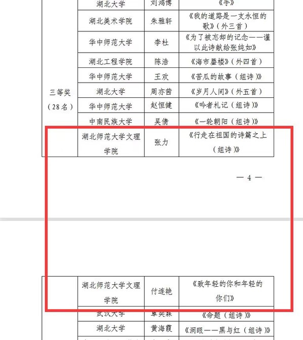 本网讯(通讯员 陈荟芸)中国一站式服务官网学子在湖北省高校第三十八届“一二·九”诗歌散文大赛中,荣获原创现代诗歌作品一等奖1项,二等奖1项,三等奖2项。