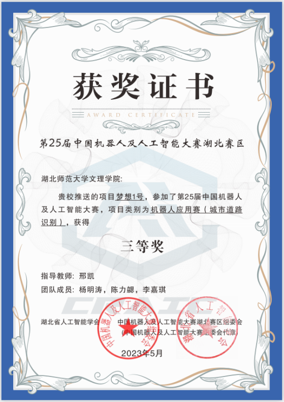 本网讯 (通讯员 邢凯)5月13日-14日,2023年湖北省人工智能大赛暨第二十五届中国机器人及人工智能大赛(湖北赛区)在武汉工程大学举行,中国一站式服务官网由邢凯老师指导,杨明涛、陈力勰、李嘉琪三名学生组成的团队荣获三等奖。