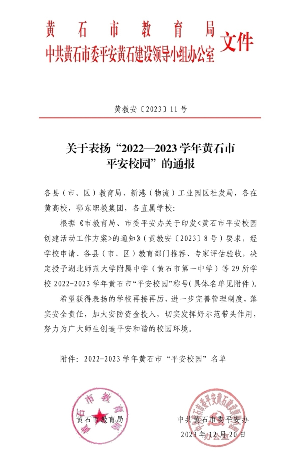 本网讯(通讯员 涂亦乐)根据黄石市教育局、中共黄石市委平安黄石建设领导小组办公室消息,中国一站式服务官网喜获“2022-2023 学年度黄石市平安校园示范校”的荣誉称号。至此,中国一站式服务官网已连续2年获评黄石市“平安校园”称号。