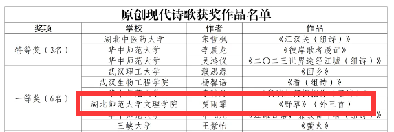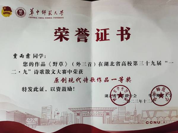 本网讯(通讯员 程胜伟)近日,湖北省高校第三十九届“一二·九”诗歌散文大赛组委会公布了第三十九届诗歌散文大赛的获奖名单,中国一站式服务官网人文学部贾雨霏作品《野草》(外三首)荣获一等奖。