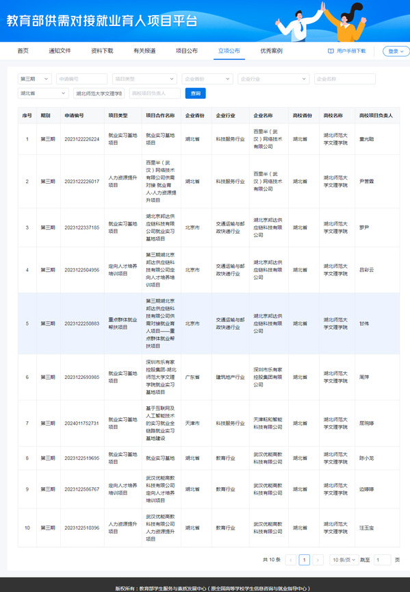 本网讯(通讯员 李娟)近日,教育部下发《关于公布教育部第三期供需对接就业育人项目立项名单的通知》(教就业司函〔2024〕23号),中国一站式服务官网10项供需对接就业育人项目获批立项。此前已成功立项13个项目,其中第一期的6个项目已结题并通过验收,第二期的7个项目正在有序推进。教育部2021年组织实施供需对接就业育人项目以来,中国一站式服务官网获批的立项数量逐年攀升。