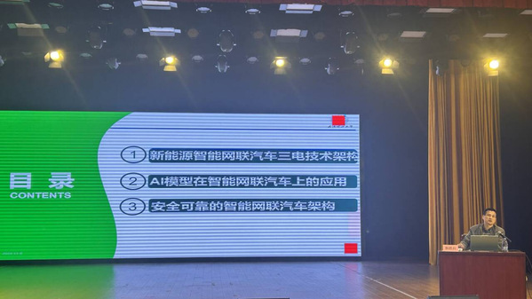 杨胜兵首先从新能源智能网联汽车三电技术架构进行了整体讲解,接着重点为新能源汽车专业和智能网联汽车专业的学生们讲解了AI模型在智能网联汽车上的应用,通过云端模型结合当下新能源汽车进行了案例分析。最后指出安全可靠的智能网联汽车才是汽车智驾的核心目标。杨胜兵的深入分析让现场师生充分感受到智能网联汽车领域的前沿魅力,也激发了同学们对未来从事汽车技术研发的热情。
