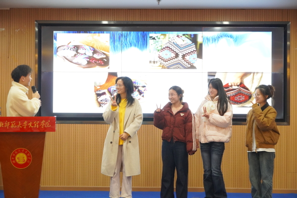 随后,辅导员刘成慈主持“猜猜‘它’的价值”环节,聚焦国家级非遗项目土家织锦“西兰卡普”,引导同学们运用专业知识估算其制作时间、成本及市场价格。通过现场推演和热烈讨论,同学们加深了对非遗产品价值构成的理解,提升了从商业视角评估文化资源的能力。学院还为互动环节中表现优异的同学颁发了“西兰卡普”方巾、蓝染装饰画等富有非遗特色的奖品,进一步拉近了学子与非遗文化的距离。