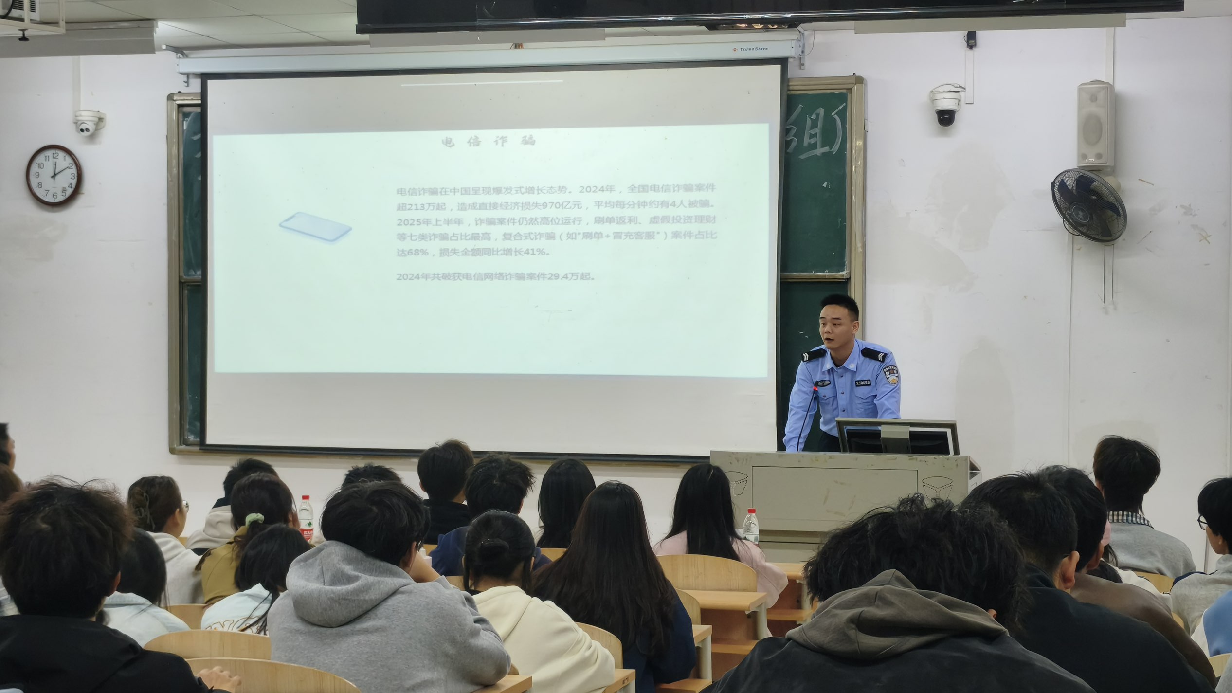 辖区派出所柯警官以“谨防电信诈骗”为题,结合高校真实案例,深入剖析了冒充客服、刷单返利、虚假购物等高发诈骗手法,强调“不轻信、不转账、不透露”的反诈原则,帮助学生筑牢“防骗墙”。